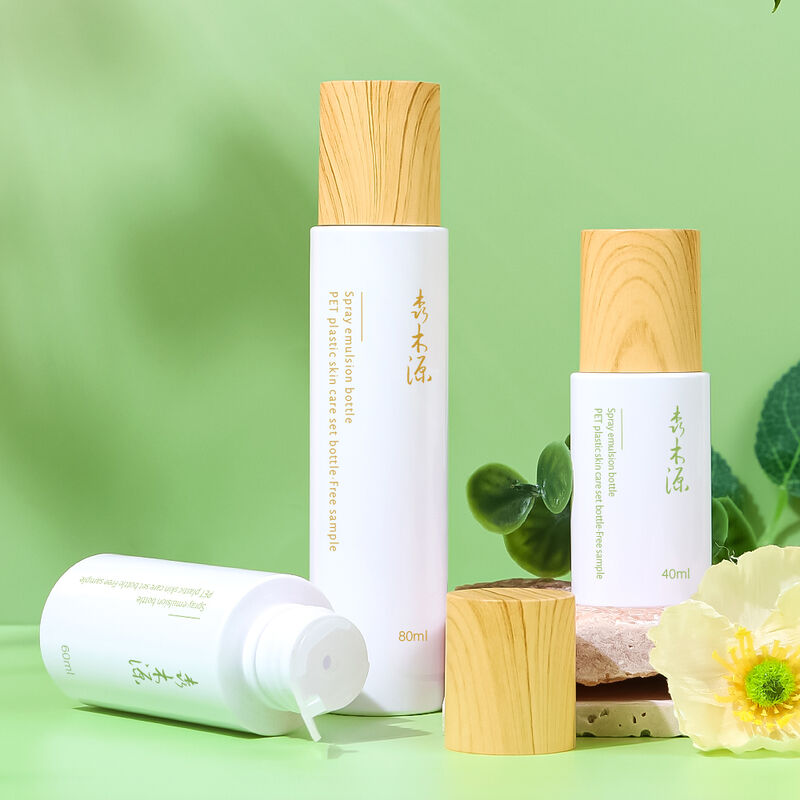 This plastic cosmetic bottle features a fresh, minimalist design ideal for beauty product packaging. Its simple and elegant texture complements various skincare product tones while enhancing visual appeal.